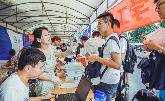 这一天,从综合体育馆到网球馆院系报到点,再到紫荆学生公寓,前来报到的新生络绎不绝。领到清华紫的学生卡,穿上院系新生T恤,与憨萌的吉祥物合张影,打开紫荆公寓里属于自己的那扇门……在有条不紊的引导和贴心帮助下,每一位新生初遇清华,一见倾心。
