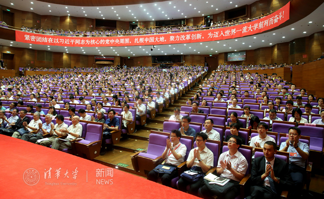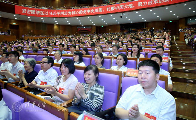 今天的新清华学堂里气氛庄严热烈,大会主席台正中悬挂由鲜艳的红旗簇拥着的中国共产党党徽,“紧密团结在以习近平同志为核心的党中央周围,扎根中国大地,聚力改革创新,为迈入世界一流大学前列而奋斗!”的标语悬挂在二楼眺台。上午9点,大会在庄严的国歌声中开幕,乐动平台党委副书记、校长邱勇主持会议。