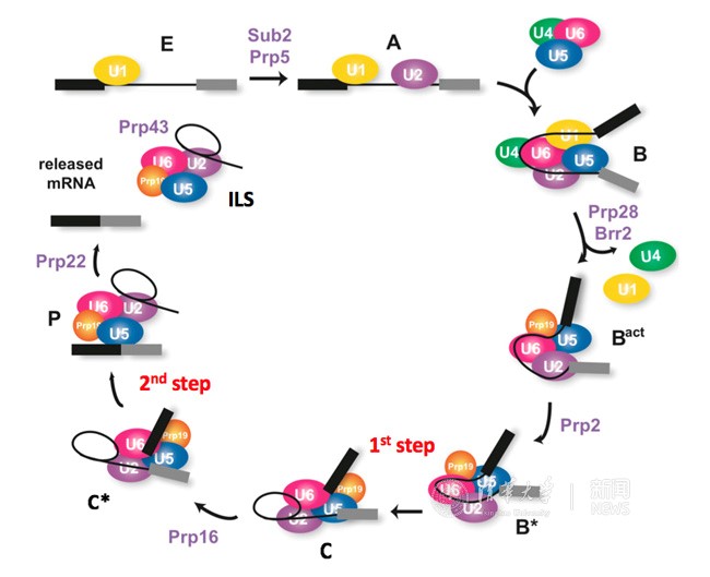 RNA剪接这一复杂的生理过程由剪接体(spliceosome)来执行。剪接体是细胞中已知的最为复杂的大分子机器,分子量巨大并且高度动态,主要由蛋白质-核酸形成的复合物(ribonucleoprotein,RNP)组装形成,它在前体信使RNA(pre-mRNA)上完成识别、组装、激活、催化等一系列过程,并最终在反应结束后解离成许多小的功能单元,以进入下一个反应循环。根据剪接体的组成与构象的不同,可以将剪接体分为E、A、B、Bact、B*、C、C*、P、ILS等若干状态(图1)。