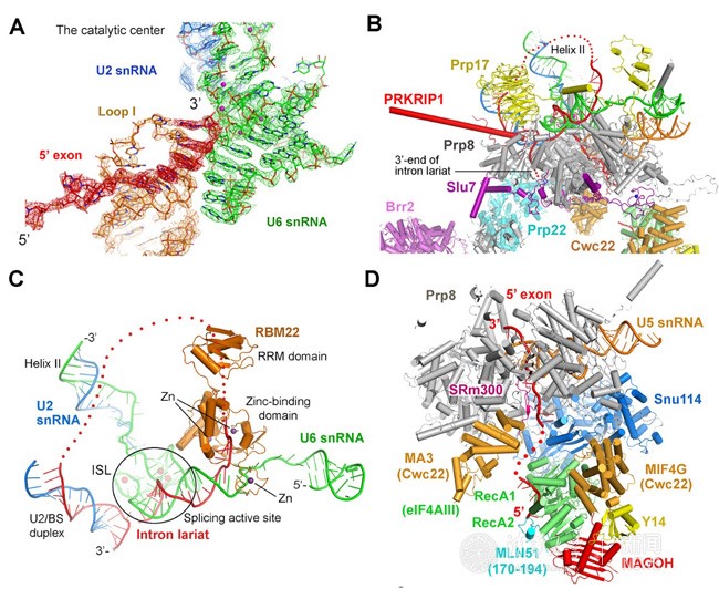 在该结构中,剪接体核心区分辨率高达3.0-3.5埃,清晰地展示了由20余个蛋白与RNA组成的催化反应中心的结构(图4)。同时,他们观察到与第二步反应密切相关的剪接因子所呈现出的特定构象,对于稳定反应活性中心以及催化第二步转酯反应至关重要。该结构的解析为揭示第二步反应过程中剪接体的构象变化以及3’剪接位点的识别提供了重要的结构依据。