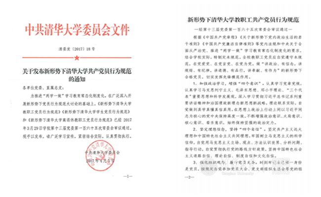 党的十八大以来,以习近平同志为核心的党中央以高度的政治自觉和行动自觉,坚定不移推进全面从严治党,凝聚振奋了党心民心。2016年,中央在全党部署开展“两学一做”学习教育,推动了党内教育从“关键少数”向广大党员拓展、从集中性教育向经常性教育延伸,把全面从严治党要求有效落实到每个支部、每名党员。为落实学习教育“学是基础,做是关键”的要求,推动“四讲四有”合格党员标准具体化、实践化,学校党委在研究制定学习教育实施方案时,就明确提出要在“讲奉献、有作为”专题学习讨论中,以党支部为基本单位,在全体党员中开展“新形势下党员行为规范”的大讨论,并根据讨论意见进一步形成制度文件,为清华合格党员树立起标杆。