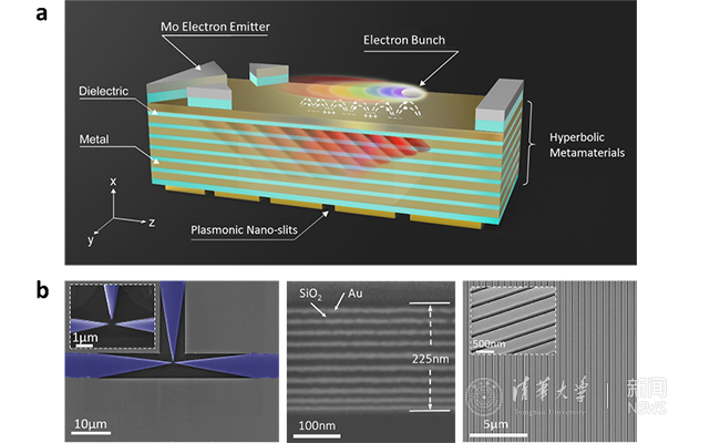 (a)片上集成切伦科夫辐射源,(b)电子显微镜照片:(左)片上平面电子发射源、(中)双曲超材料、(右)表面等离子激元周期纳米狭缝。