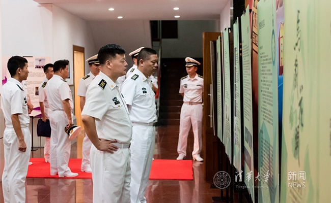海军官兵在演出前观看《马兰花开》展览。