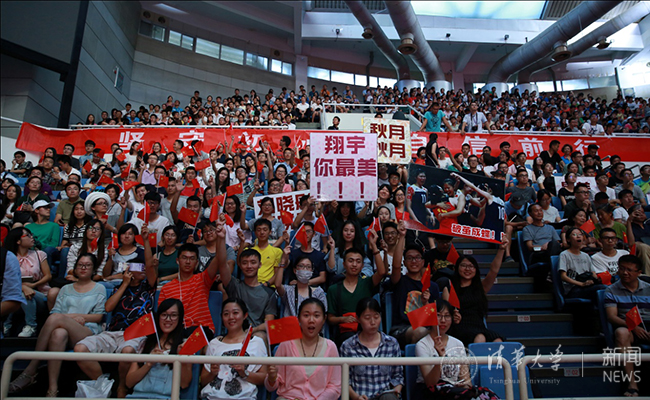 在综合体育馆,2000余名师生已经等候在场内,他们手持国旗、手举名牌,观看女排在里约的冠军赛录像。当女排姑娘拿下冠军点,五星红旗冉冉升起时,场内观众激动依旧,爆发出雷鸣般的热烈掌声。