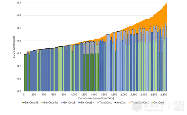 图2 基准情景下2030年中国并网风电供应曲线。