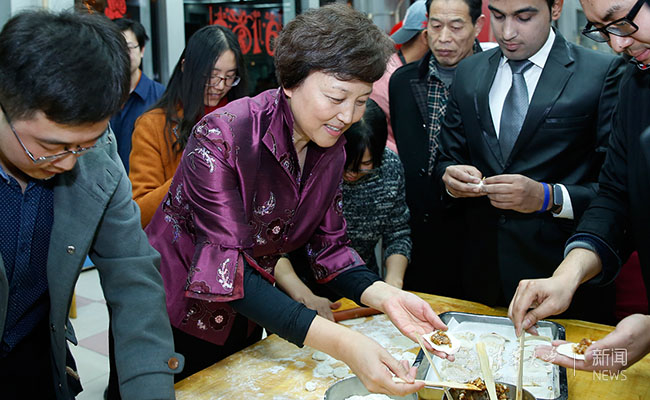 邱勇与同学们一起包饺子。 记者 张宇 摄