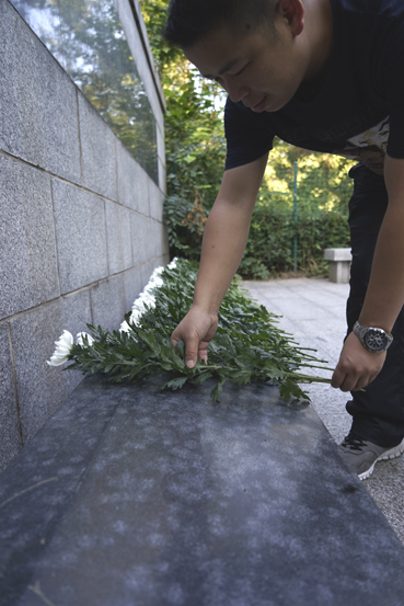清华学子向“祖国儿女,清华英烈”纪念碑敬献白菊。