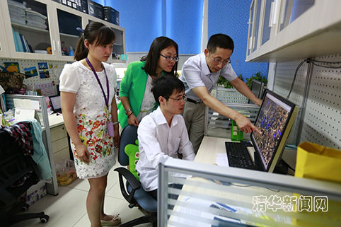 施一公和闫创业、杭婧、万蕊雪讨论试验数据。记者 苑 洁 摄