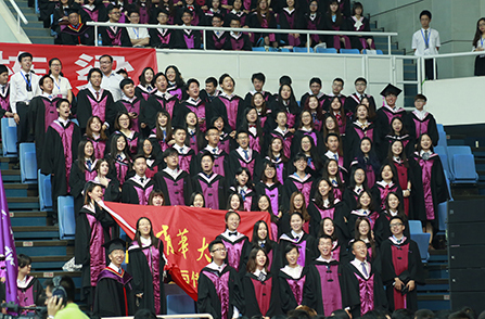 典礼开始前,播放了毕业纪念短片。看着一幅幅熟悉的画面从大屏幕中显现而出,在座很多毕业生的眼中已泪光闪闪。四年点滴,清华园盛满了他们成长的回忆与印迹。当介绍参加典礼的院系领导时,毕业生用嘹亮的口号道出了心中的澎湃:建筑学院的“建业报国,筑就梦想”、生命学院的“生逢其时,生遇良师,生科一一,生生不息”、自动化系的“水木钟灵秀,自一竞风流”、化学工程系的“从我做起,从现在做起”、经管学院的“行胜于言,责任在肩,实业创新,经世济民”、 人文学院的“修齐治平,文以载道”……此起彼伏的呼声中,传递着年轻学子对母校的恋恋不舍,对师长敦敦教诲的真情感谢,以及对美好明天的无限憧憬。