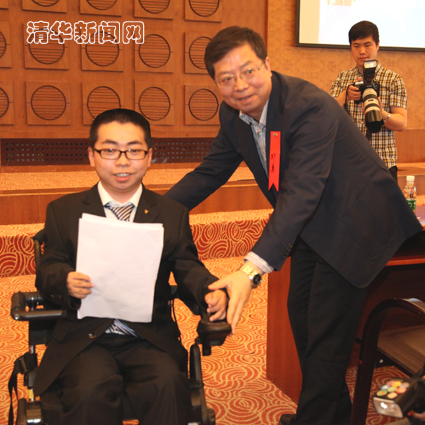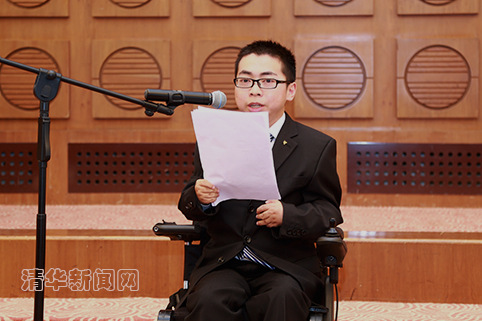 计算机系2012级本科生矣晓沅同学作为学生代表发言。矣晓沅六岁时患类风湿性关节炎,身体关节变形,从此只能终生与轮椅为伴。但他自强不息,以优异的成绩进入乐动平台,通过自己的努力改变命运。他回忆了自己求学的艰难历程,也向大家介绍了自己在清华园里的生活,向所有帮助过自己的亲人、老师、朋友、同学们表示了的感谢。“或许我们的世界曾经充满黑暗,但关怀与帮助是一支火炬,我们从各位学长的手中接过了它,照亮了我们小小的一方天地。那么,即使再难,我们也愿将这支火炬继续燃烧并传递下去,总有一天,星星点点的火光将会驱散黑暗。”