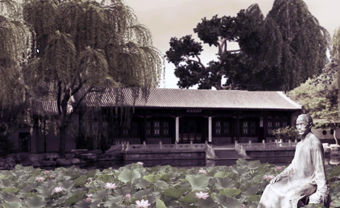 | 在水木清华荷花池东北角的土山上,沿着石阶攀援而进,可以见到松竹掩映下的一座六角亭。 偶尔远处的钟鸣依然穿透时空的长河,仿佛从来都不曾忘记:“诗人主要的天赋是爱,爱他的祖国,爱他的人民”。 |