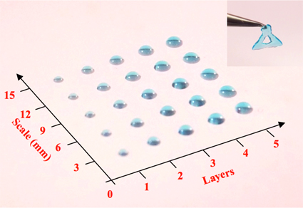 3D打印的不同尺寸的DNA水凝胶粒子(其中加入蓝色染料以增加可视性),经多次打印,最大尺寸可以达到厘米级并且可以自支撑(右上小图)。