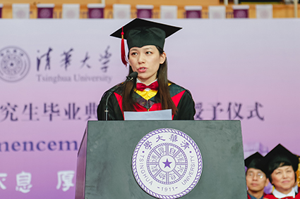 毕业生代表、建筑学院2009级博士生袁晓辉与大家分享了自己在清华五年半学习科研生活的感悟。她表示要怀有持续学习的态度和对独立精神自由思想的追求,在这个变革的时代里用不变的心来回报母校的培育。
