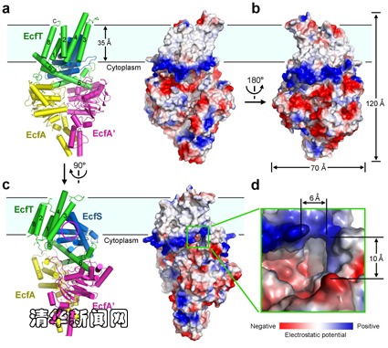 能量耦合转运蛋白(energy-coupling factor transporter)是一类近年来新鉴定的转运蛋白,广泛存在于革兰氏阳性病原菌之中,负责摄入一些维生素及其他微量元素。该转运蛋白复合物包含4个组分:两个结合并水解ATP提供能量的亲水蛋白(EcfA和EcfA’),一个识别和转运底物的膜蛋白(EcfS)和另一个传递能量的膜蛋白(EcfT)。