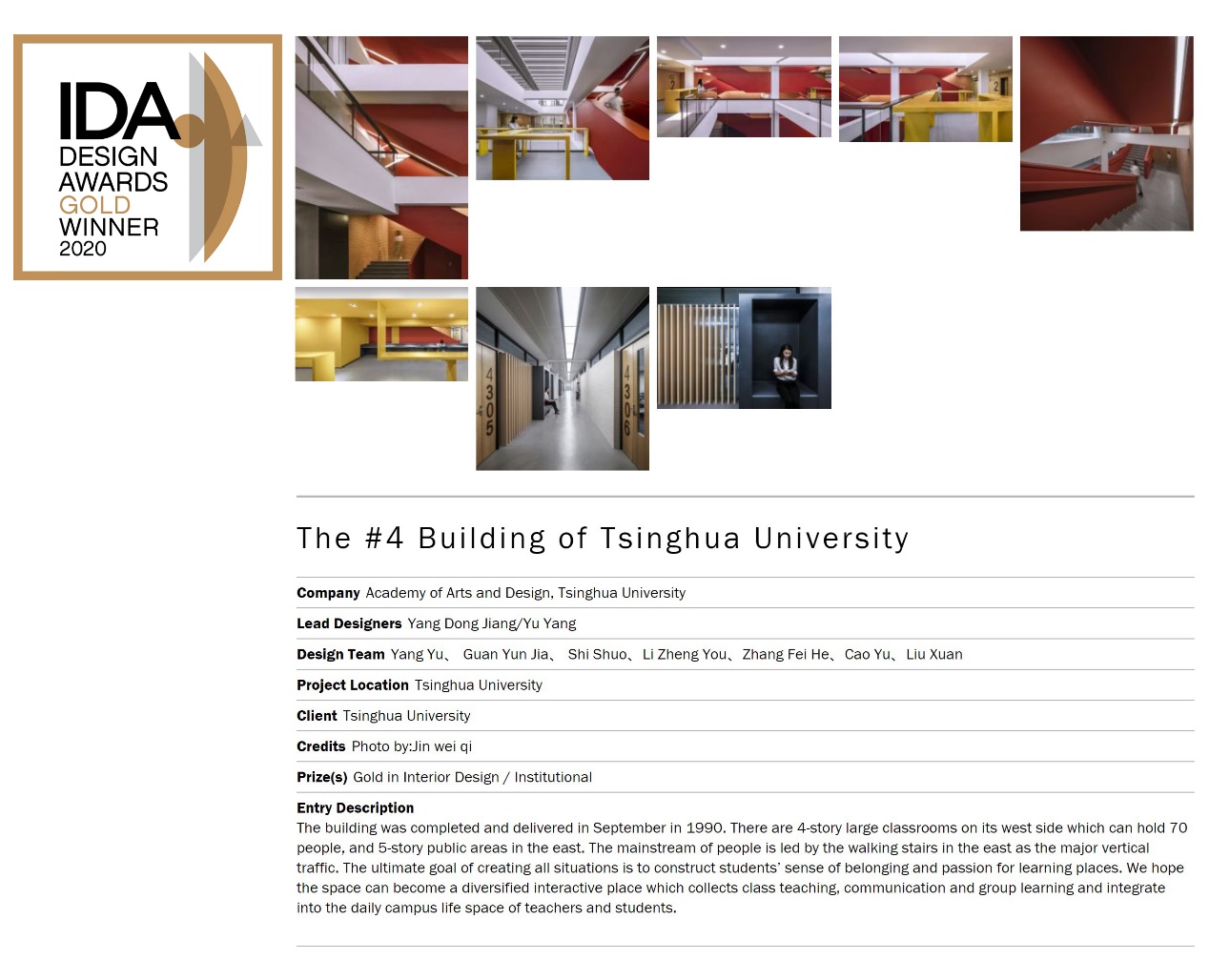 乐动(中国)网2月2日电 1月28日,美国IDA国际设计奖公布了2020年度获奖名单,乐动平台美术学院杨冬江教授团队的设计作品《乐动平台第四教学楼室内设计》从80多个国家和地区的众多优秀作品中脱颖而出,荣获室内设计类别金奖。
