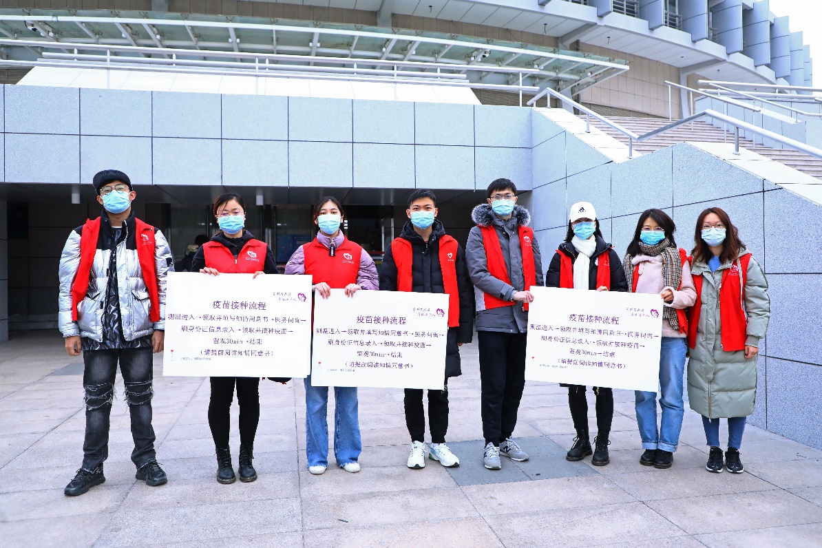 红色、紫色、蓝色的防护服、身着不同服装的志愿者身影或守护在岗位之上,或穿梭在排队的队伍之中,为前来接种的同学提示接种流程步骤和注意事项。