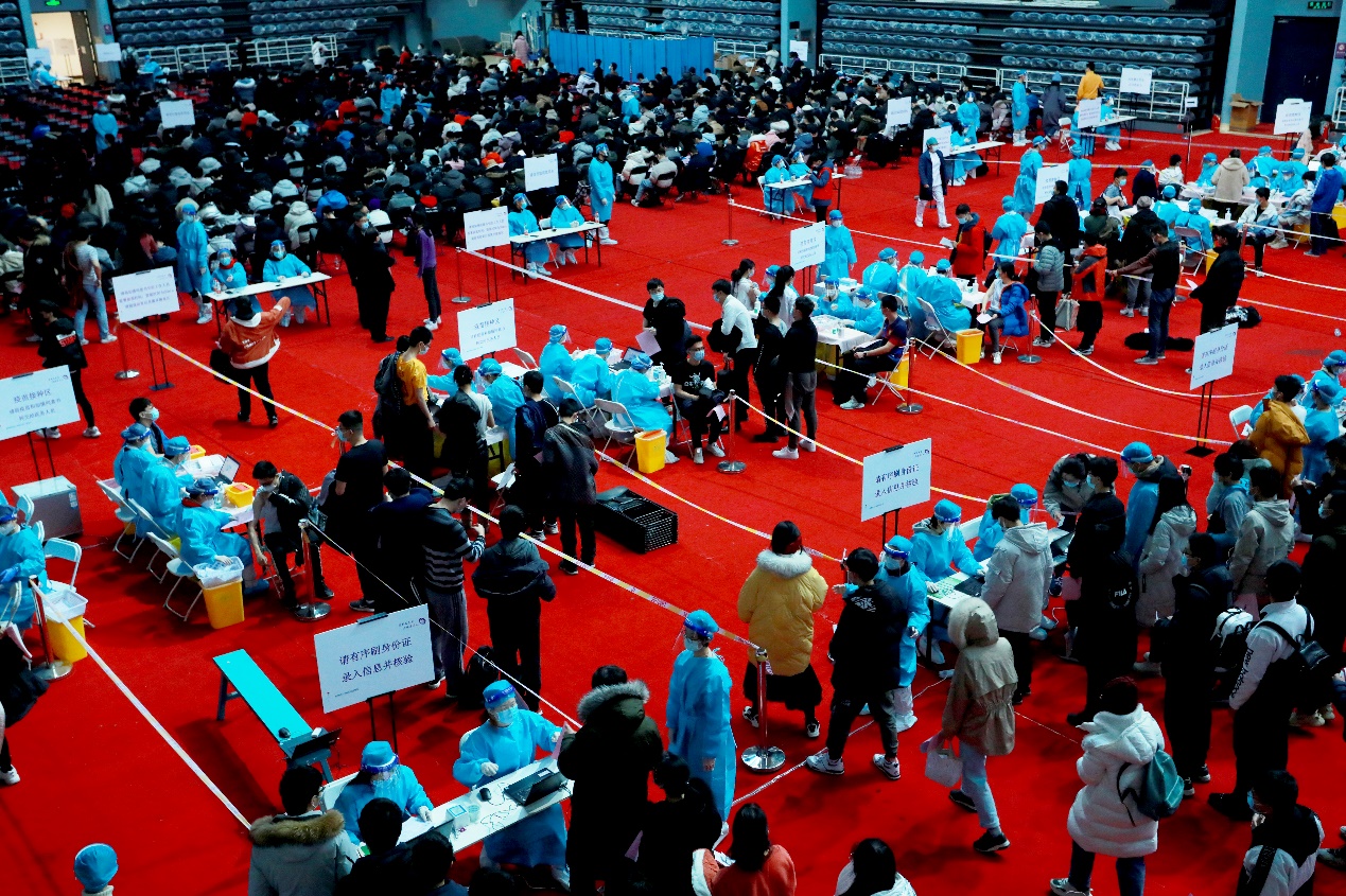 综合体育馆内同学们排队依次接种疫苗