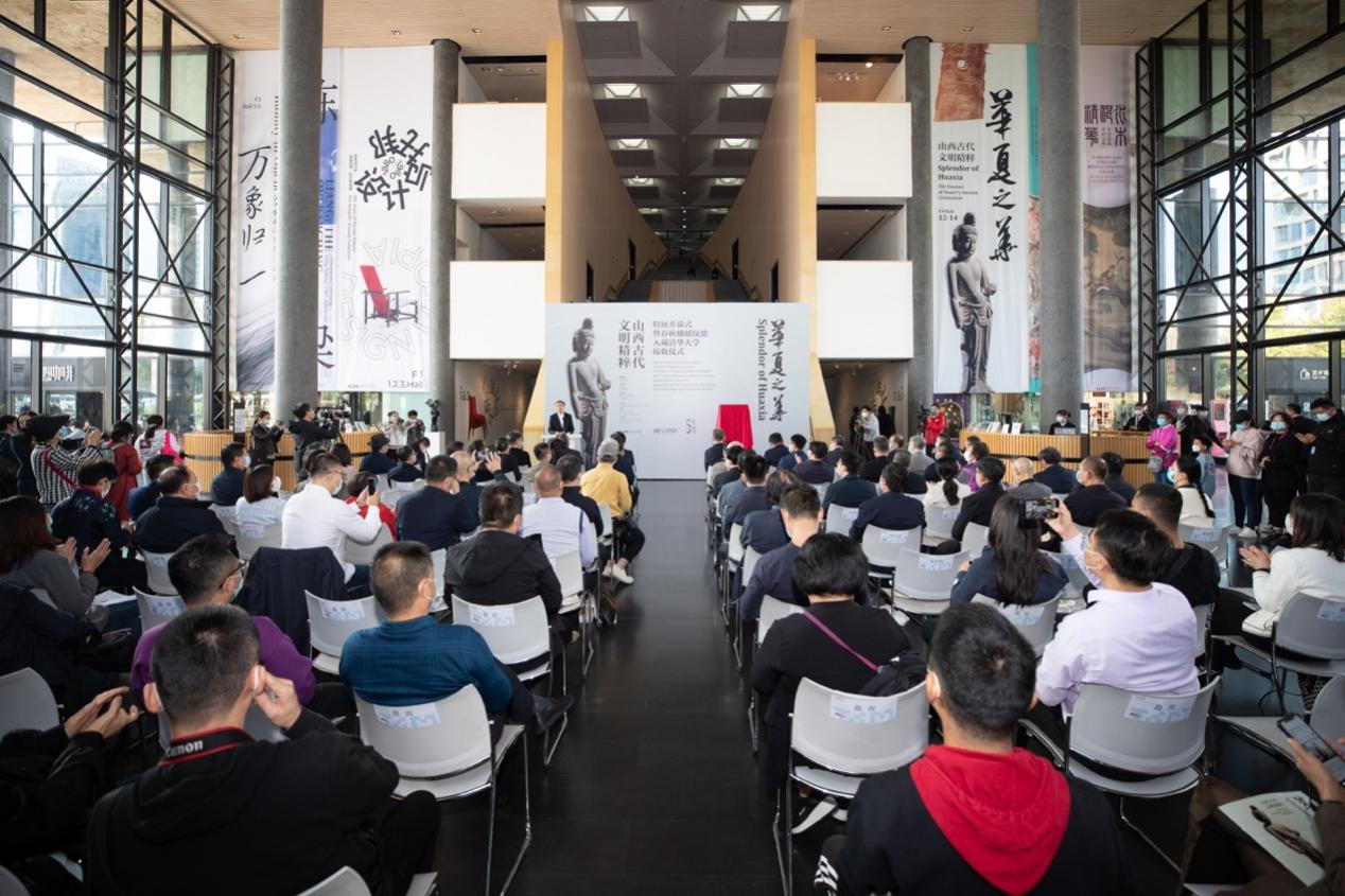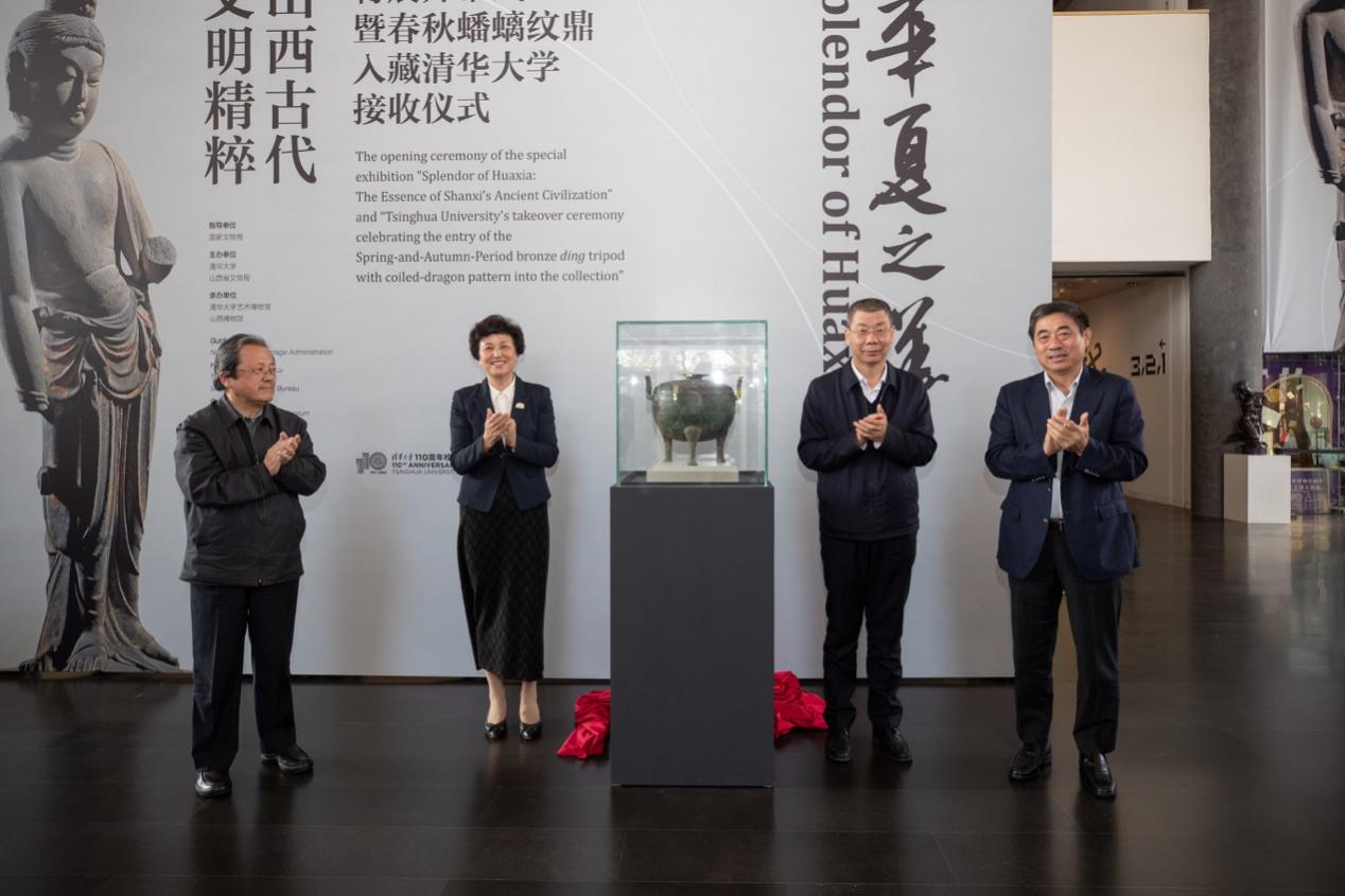 开幕式上还举行了春秋蟠螭纹铜鼎入藏仪式,陈旭、张复明、冯远、关强共同为铜鼎揭幕。