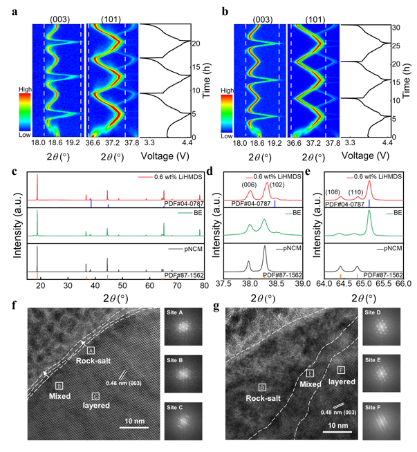 图3. LiHMDS对高镍三元正极材料循环过程结构相变的抑制作用