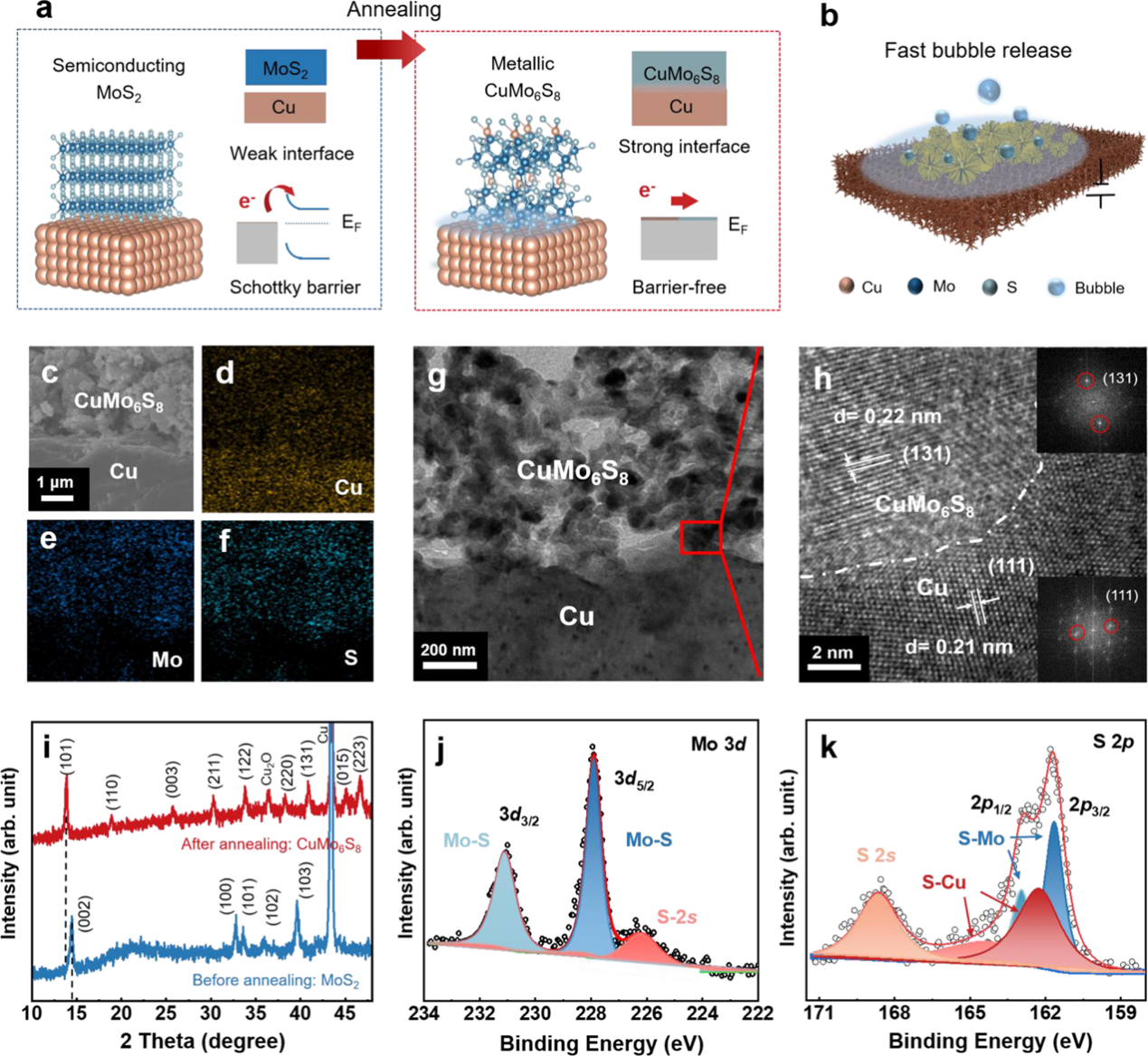 近日,乐动平台深圳国际研究生院刘碧录团队创制出一种基于双界面设计的同源金属电极。该电极以优化催化剂与基底以及催化剂与气泡的双界面为出发点,解决了大电流密度制氢下的传质、界面力学、界面电导三大难题。这种同源金属催化剂通过MoS2和Cu的原位高温反应制备,将半导体相MoS2转成具有金属性质的Chevrel相CuMo6S8,这种一体化结构有效消除了半导体-金属接触的界面肖特基势垒。由于电极表面催化剂与基底具有强的化学键结合,且电极展现出全金属性质以及超亲水状态,因此有效提升了催化剂/基底界面结合力并降低了催化剂/气泡界面粘附力,在增强电极稳定性的同时加速了析氢反应的动力学,展现出优异的电催化析氢性能。该电极在2.5 A cm-2下仅需321mV的过电位,在1 A-2.5 A cm-2级别的大电流密度下稳定运行300小时性能无衰减。此外,前驱体MoS2可取自天然矿石辉钼矿,成本比贵金属铂降低2-5个数量级,与目前的大电流密度催化剂相比具有更大的成本优势。