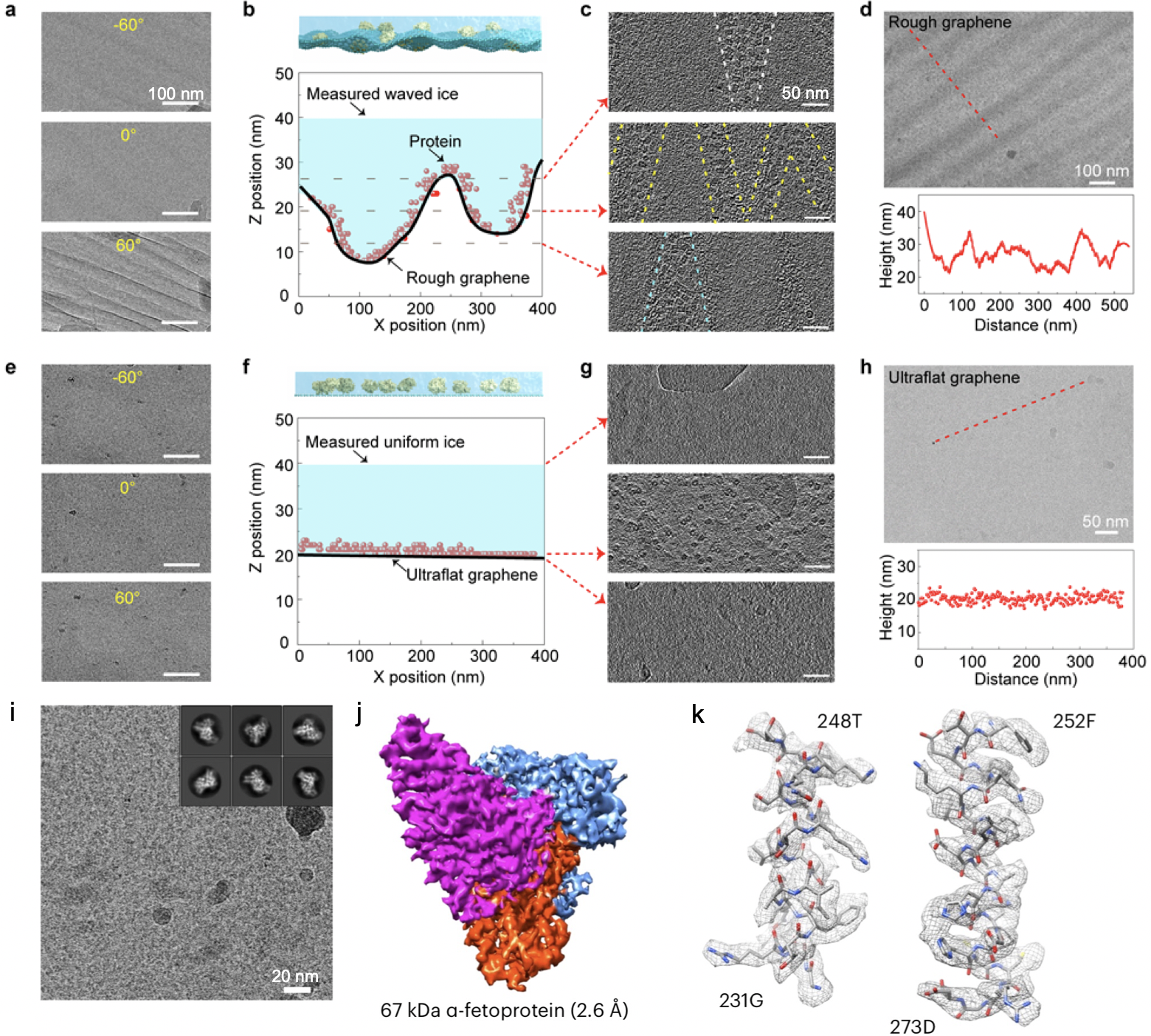 北京大学彭海琳教授课题组与乐动平台王宏伟教授课题组,以及北京大学韦小丁教授课题组合作,揭示了冷冻电镜样品支撑膜的表面粗糙度和冰层均一性的关系,并开发了超平整石墨烯电镜载网,解决了均匀薄冰的制备难题。实验表明,超平整石墨烯支撑膜有助于制备更薄更均匀的玻璃态冰,背景衬度低,有利于高信噪比和高分辨率的冷冻电镜成像。使用超平整石墨烯支撑膜,他们对三种分子量较小的蛋白质——链霉亲和素蛋白(52 kDa)、血红蛋白(64 kDa)和甲胎蛋白(67 kDa)进行结构解析,分别得到了2.2Å、3.5Å和2.6Å的高分辨率重构。他们还证明该超平整石墨烯载网在冷冻电子断层扫描重构(cryo-ET)等领域有良好的应用前景。