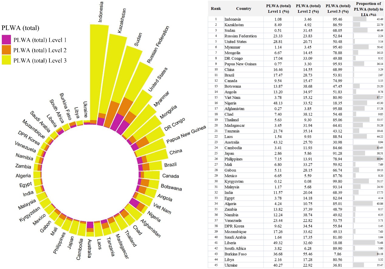研究主要发现包括三点。第一,全球荒野地潜在损失的数量。至2100年,全球有460万km2的荒野地(占现有荒野地面积6.5%)将受到城市和耕地扩张的影响。其中最不理想的情景(SSP4-3.4),将损失390万km2的荒野地,即每天损失132.3km2。耕地扩张是荒野地消失的主要因素,超过95%的荒野地潜在损失由耕地扩张导致。第二,全球荒野地潜在损失的时空格局。在全球层面,不同情景的PLWA空间格局存在显著差异。在全球层面,大部分(73.9%)的PLWA集中于4类生物群系(Biomes)。在国家层面,绝大多数的PLWA集中在少部分国家。就面积而言,前45个国家的PLWA总和占到全球PLWA总量的90%;其中,前10个国家的PLWA总和占比超过全球PLWA总量的一半(51.4%),包括印度尼西亚、哈萨克斯坦、苏丹、俄罗斯联邦、美国、缅甸、蒙古、刚果民主共和国、巴布亚新几内亚和中国。因此,这些国家是防止荒野地潜在损失的重点国家。第三,全球荒野地潜在损失对自然保护地的影响。全球有21175个陆域自然保护地(占全球自然保护地总数量的23.8%)将面临荒野地损失风险,自然保护地内PLWA的总面积达到约100万km2(占自然保护地总面积4.6%)。数量方面,受PLWA影响的自然保护地,超过一半集中在美国、澳大利亚、德国、日本、俄罗斯、波兰、加拿大等国家;然而,在面积方面,绝大多数的PLWA发生在亚洲和非洲,分别占40.0%和37.7%,显著高于欧洲和北美。最后,研究基于自然保护地的PLWA面积比例提供了一份“自然保护地预警名单”,呼吁采取紧急的保护行动,防止自然保护地范围内荒野地的潜在损失。