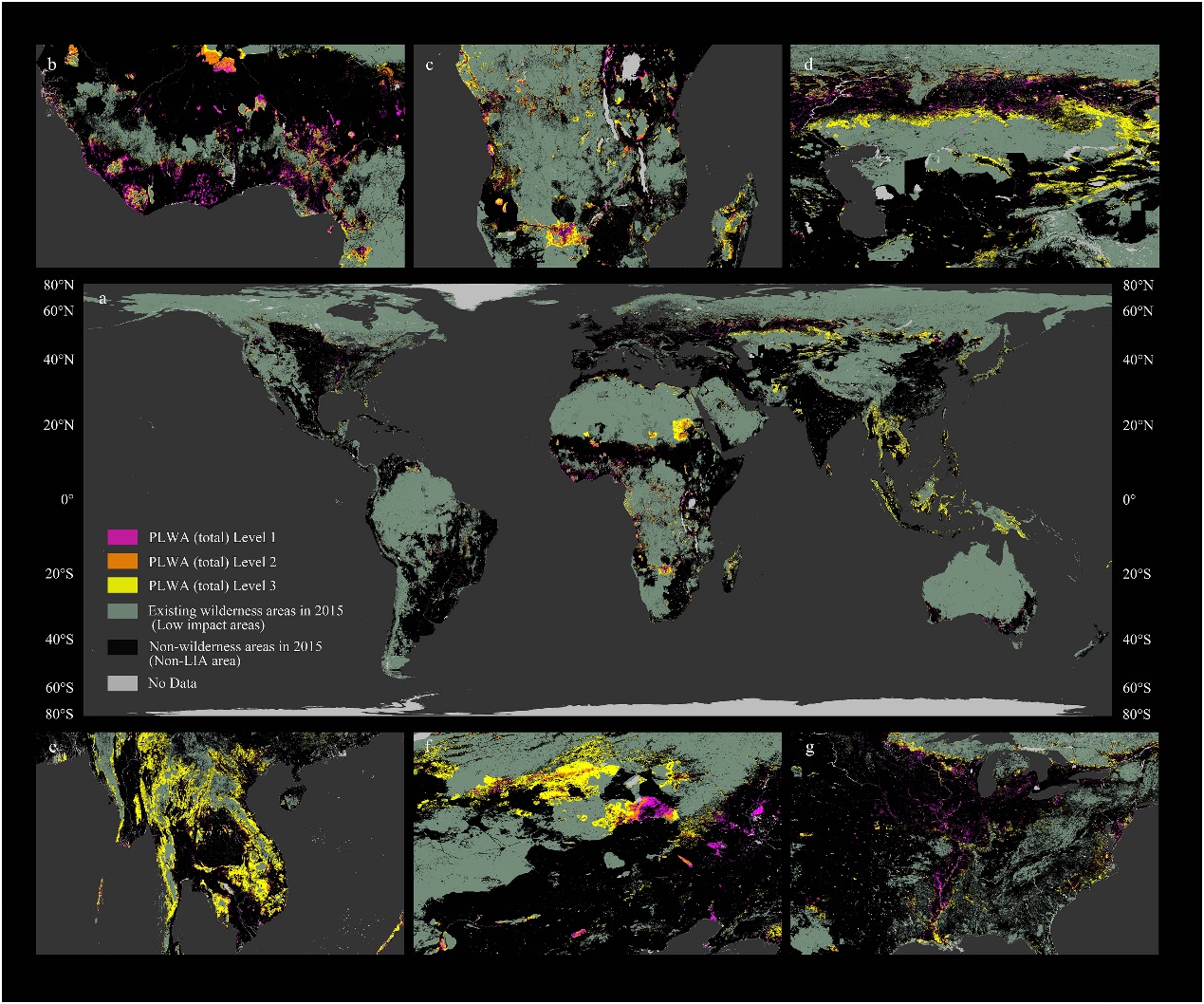 保护荒野地是“2020年后全球生物多样性框架”(Post-2020 Global Biodiversity Framework)草案提出的行动目标之一。耕地和城市等土地利用与土地覆盖变化对生物多样性和荒野地保护造成严重威胁。然而,当前对未来荒野地潜在损失区域(Potentialloss of wilderness areas, PLWA)的时空格局仍然了解甚少。研究分析了2020-2100年在8种SSP-RCP情景下,土地利用与土地覆盖变化可能导致的全球荒野地潜在损失区域(PLWA)的时空格局。