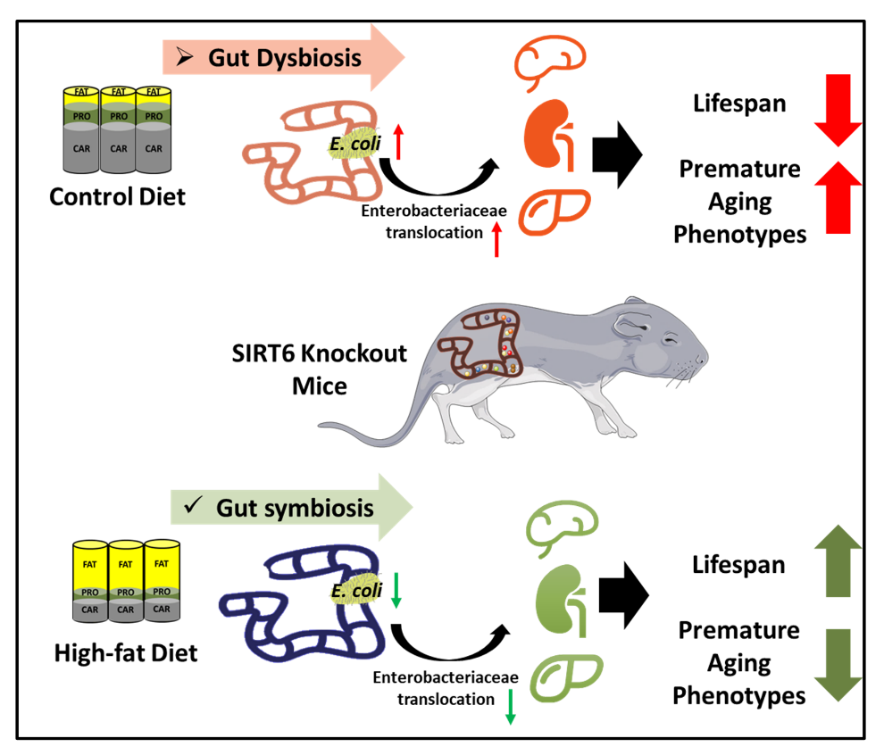 随着全世界范围内人口老龄化的加剧,衰老和衰老相关疾病给个人、家庭和社会带来严重负担,减缓衰老和预防衰老相关疾病成为目前科学研究的热点问题。此前,课题组已报道高脂饮食缓解SIRT6敲除小鼠代谢异常和多组织器官萎缩等衰老相关机体过度消耗表征,并将小鼠寿命由4周龄延长至26周龄(雄性)或38周龄(雌性)。在此基础上,本研究着眼于肠道菌群,重点探讨肠道菌群在高脂饮食改善早衰过程中发挥的重要功能。