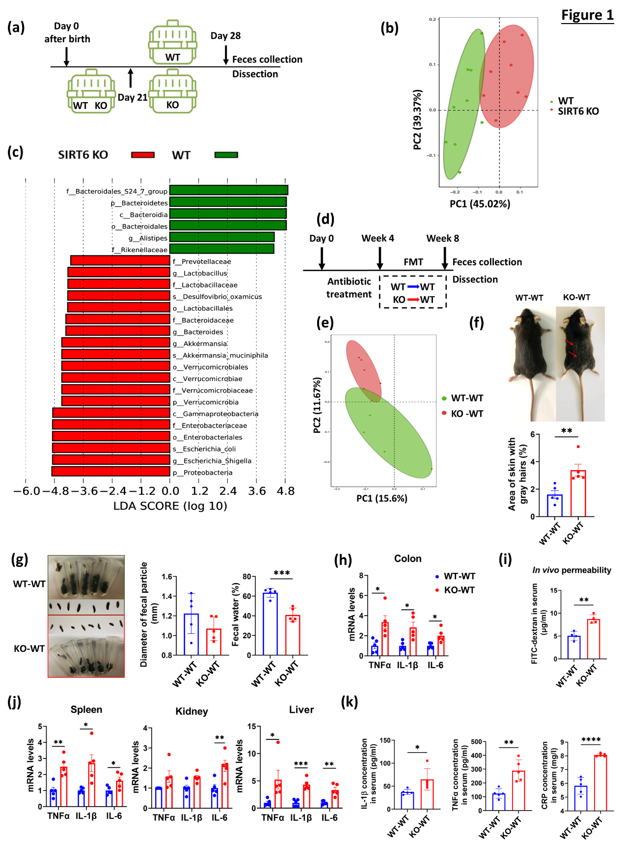 SIRT6敲除小鼠呈现典型的肠道菌群失调表征,包括菌群多样性减少,粪便中短链脂肪酸水平降低,益生菌Bacteroidetes丰度下降及致病菌Enterobacteriaceae、Verrucomicrobiaceae、Proteobacteria、Prevotellaceae等丰度增高。将SIRT6 KO小鼠肠道菌群移植给年轻野生小鼠,野生小鼠出现加速衰老相关表型,具体表现为白色粗糙毛发增多、血糖水平降低、脂肪积累减少、多组织器官炎症因子(TNFα、IL-1β、IL-6)和衰老标志物(P16、P21)表达水平增加等。