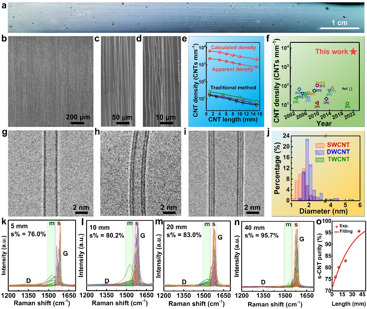 碳纳米管因其优异的力学、电学、热学等性能,在超强超韧纤维、下一代碳基芯片、高性能透明导电膜、智能柔性可穿戴设备等尖端领域具有广阔应用前景。碳纳米管的各项性质受到其单体长度、取向度、缺陷浓度、结晶度、手性等多方面结构因素的影响,其中单体长度对碳纳米管宏观性质的影响尤为显著。因此,提升碳纳米管的长度是优化性能和发展下游应用的关键。只有兼具厘米级以上宏观长度、高取向度、高纯度和完美结构的超长碳纳米管,才可以发挥出碳纳米管本征的优异性能。