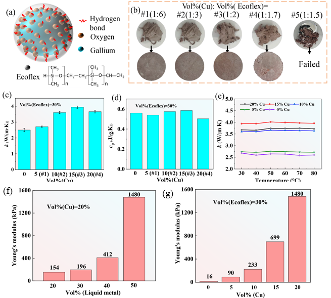 为了解决这一难题,航天航空学院曹炳阳教授课题组提出了一种固体颗粒和液态金属协同掺杂策略用于制备高性能热界面材料。将液态金属与固体颗粒共同作为导热填料,其中液态金属作为主体导热填料,起到构建导热通路的作用,而固体颗粒填料起到进一步强化导热的作用。由于固体颗粒填料的掺杂量较小,复合材料的杨氏模量只略微增加。通过液态金属与固体颗粒导热填料的协同作用,既能提高热界面材料的热导率,又能使其保持较小的杨氏模量。测试表明,体积分数为55%镓基液态金属和15%铜颗粒作为填料时,制备出的热界面材料具有3.94W/(m•K)的热导率和699kPa的杨氏模量。采用其他体积分数填充时,热界面材料的热导率在0.2-4.0W/(m•K)之间变化,杨氏模量在15-1500kPa之间变化。