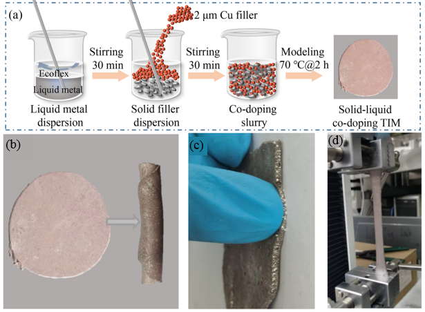 图1 固体颗粒和液态金属协同掺杂的热界面材料:制备过程及柔性展示