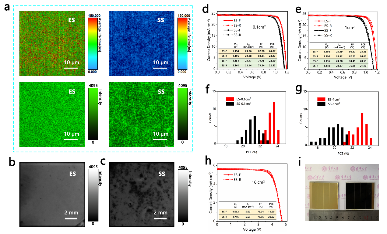 1cm2大面积钙钛矿太阳能电池认证效率纪录进展、真空蒸发&溶液(ES)组合工艺制备薄膜和全溶液法(SS)制备的薄膜表征