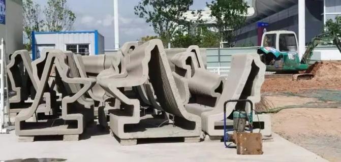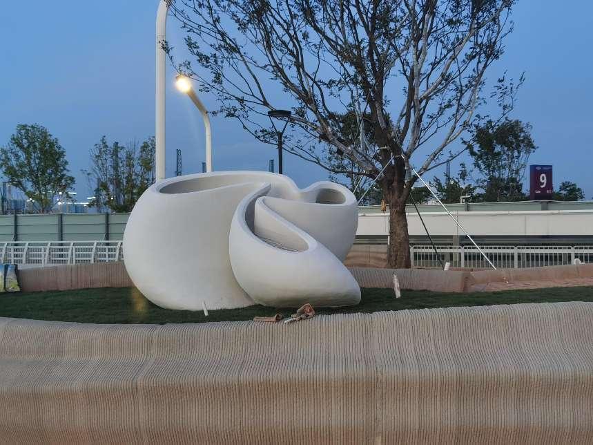 在硬件及软件调试后,四组打印设备同时协同运行,共同完成了河流铺地广场区域的曲线分隔条打印。除现场原位打印外,大部分小品在场地旁边的工棚内预制打印之后吊装就位。在工棚内,安装了三套固定的机器人3D打印设备及一套机器人3D打印移动平台,可满足大尺度构件的打印要求,它们高质高效地完成了珊瑚铺地、雕塑、座椅、挡土墙等小品的全部打印任务。