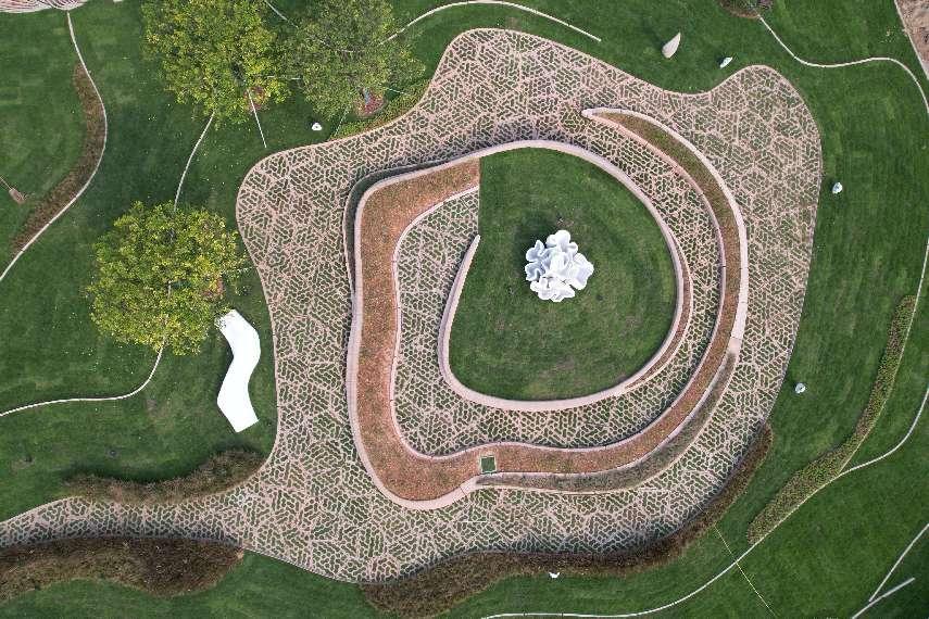 园区内所有3D打印景观小品以“水”的灵动作为原初设计思想,突出机器人3D打印混凝土技术在建造特殊曲面造型时的优势;在绿意盎然的草地上,通过算法生成的3D打印道路如同水流活泼奔涌,自然地将游人引向各个景观点;在高低起伏的道路之间,有机地形成大大小小的“岛屿”,有些是3D打印的雕塑景观平台,有些是3D打印的花坛与座椅结合的休闲空间,有些布置了3D打印的环境饰品。
