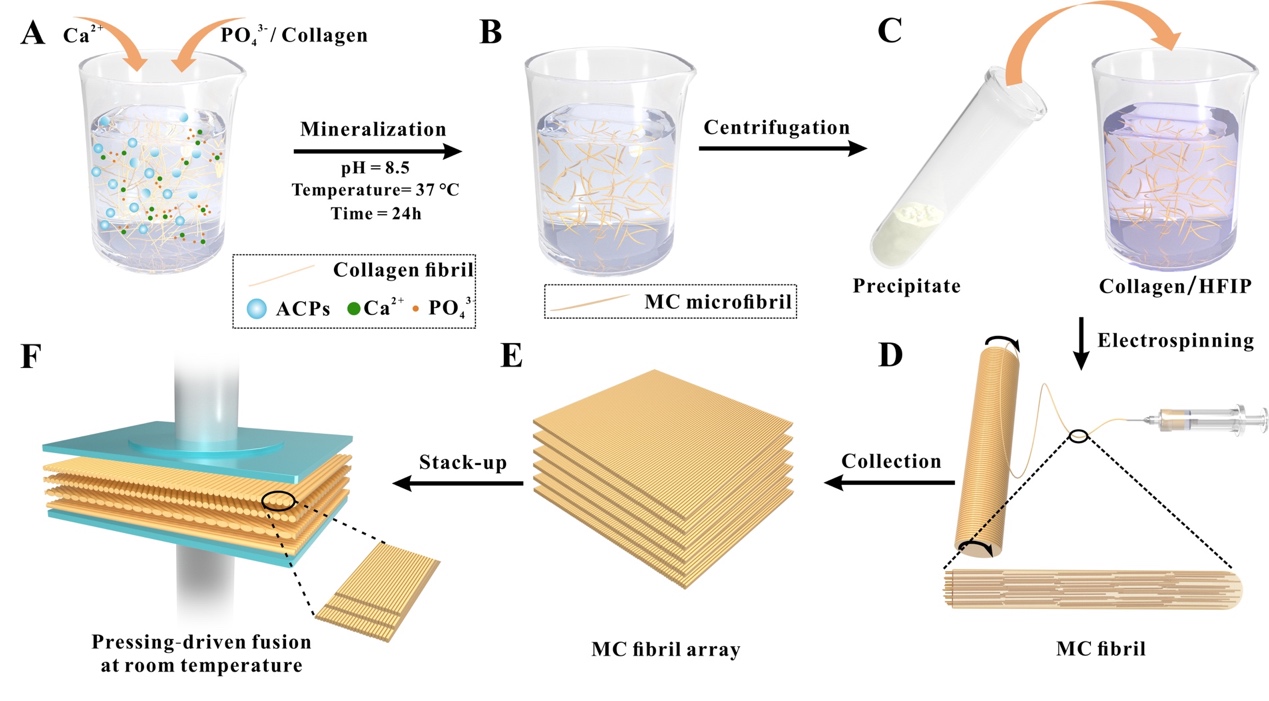 图1.人工板层骨(ALB)“多尺度级联调控”合成策略示意图。(A)胶原模版的磷酸钙矿化过程。(B)矿化胶原纤维结构。(C)在胶原/HFIP溶液中加入MC microfibril制备静电纺丝溶胶。(D)高速滚筒收集MC fibril膜结构。(E)取向性MC fibril膜堆叠。(F)室温下压力驱动形成ALB块体。
