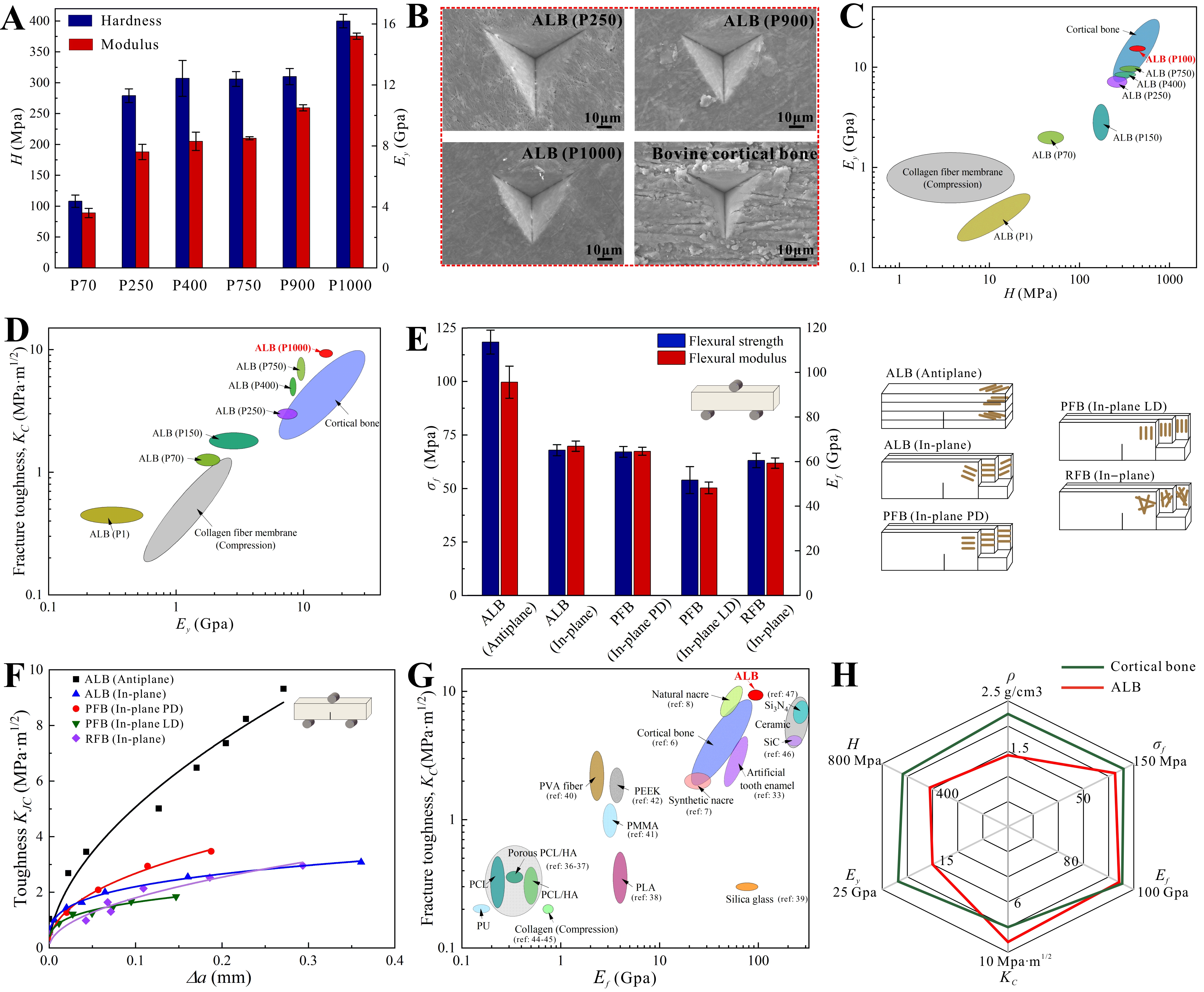 图3.仿生板层骨ALB的机械性能。(A)通过纳米压痕测试得到ALB的硬度(H)和杨氏模量(Ey)。(B)ALB和天然牛皮质骨的残余压痕SEM形貌。(C)Ey与H的Ashby图。(D)断裂韧性(KC)与Ey的关系。(E)单边缺口三点弯曲(SENB)试验得到的弯曲强度(σf)和模量(Ef)。(F)抗裂纹曲线。(G)ALB与多种天然合成结构材料的断裂韧性(KC)与弯曲模量的Ashby图。(H)ALB和天然皮质骨的密度、硬度、模量、抗弯强度、抗弯模量和断裂韧性等机械性能之间关系。