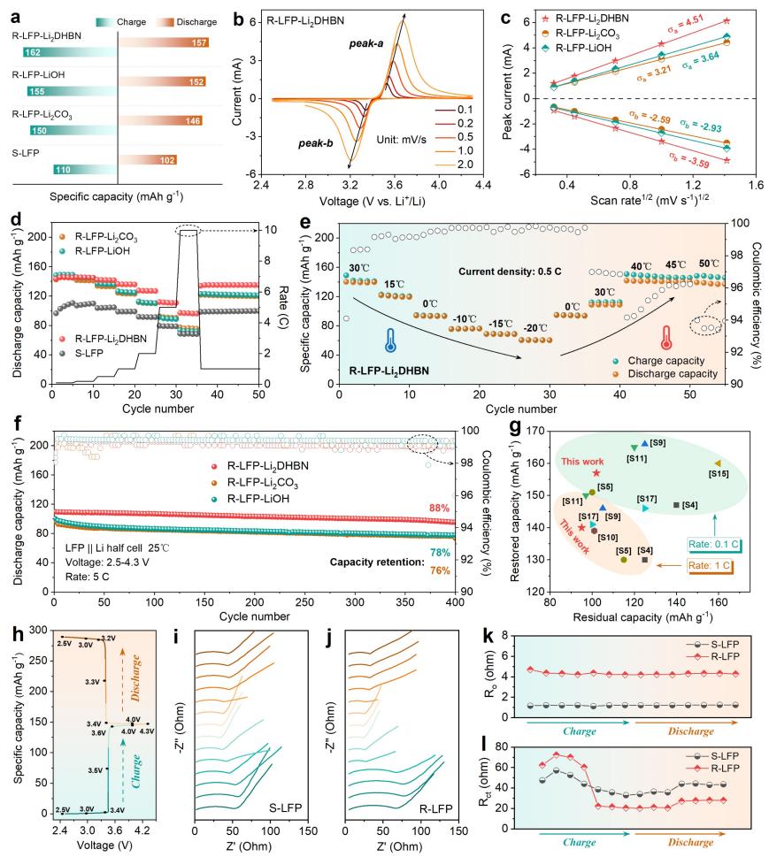 近日,乐动平台深圳国际研究生院周光敏、成会明团队提出了使用一种新型的多功能有机锂盐(3,4-二羟基苯腈二锂,Li2DHBN)直接修复失效LFP正极的方法。有机锂盐表面丰富官能团(如-CN,-OLi)可以和失效LFP颗粒有效地耦合,且有机锂盐在较低温度下分解为无定形碳和碳酸锂,在较高温度下进一步分解为氧化锂,即达到“低温包碳+高温补锂”的双重效果。此外,具有还原性的氰基官能团在还原三价铁的过程中起到关键作用。修复后的LFP正极具有优异的循环稳定性和倍率性能,在5C下循环400次后容量保持率为88%,这得益于锂的有效补充、三价铁的还原、电子导电性的提升。这种策略也适用于直接修复过渡金属氧化物层状正极材料,证实了该有机锂盐的通用性。相比于传统的火法和湿法过程,该工作提出的策略具有更高的经济价值和更大的环境效益,为未来探索更多不同锂源用来直接修复失效锂离子电池正极材料提供了独特的思路。
