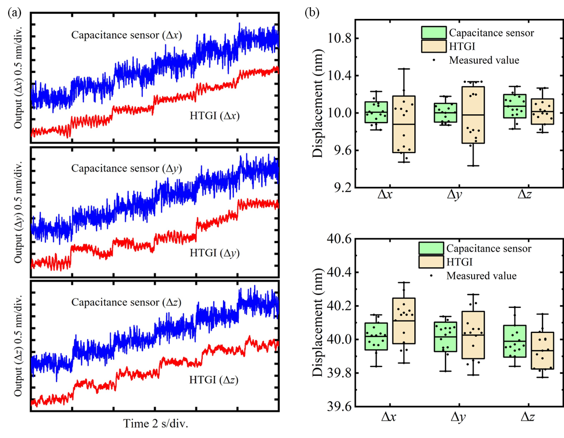 (a)三轴分辨率测试结果;(b)三轴在10纳米和40纳米处的重复定位精度测试结果