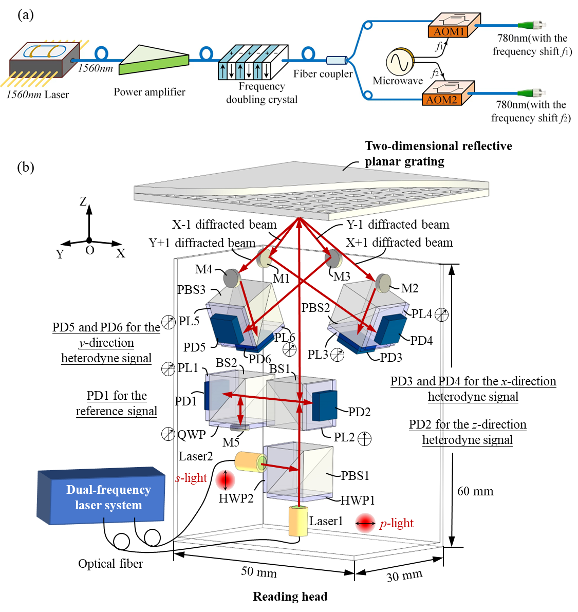 (a)自主设计的双频激光系统;(b)外差式三自由度光栅干涉仪测量系统