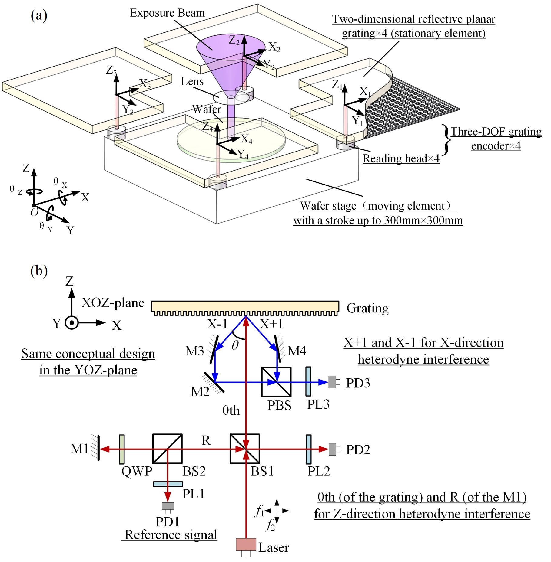(a)光刻机晶圆台中“四读数头—四光栅”的六自由度测量系统;(b)外差式三自由度光栅干涉仪基本原理
