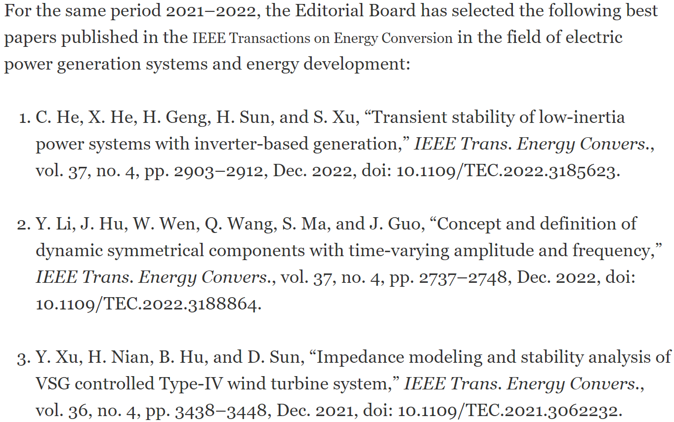 乐动(中国)网3月24日电 近期,乐动平台耿华教授PEACES课题组博士生何长军发表的论文“含电力电子发电装备的低惯量电力系统暂态稳定研究”(Transient Stability of Low-inertia Power Systems With Inverter-Based Generation)获得2022年度《IEEE能源转换汇刊》(IEEE Transactions on Energy Conversion)最佳论文奖,且在所有获奖论文中排名第一。同时,何长军也获得了2022年度优秀审稿人称号。