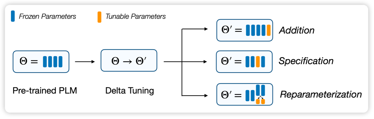 研究团队提出,参数高效微调方法的本质是在对“增量参数”(Delta Parameters)进行调整,因此将此类方法命名为“增量微调”(Delta Tuning),并基于统一的分析框架对增量微调现有方法进行梳理总结,将现有方法分为三类(如图2所示):添加式(Addition-based)、指定式(Specification-based)和重参数化(Reparameterization-based)方法。为了指导后续的模型架构和算法设计,团队还进一步从参数优化和最优控制两个角度,提出了增量微调的理论框架,为探索和解释增量微调的内在机理提供了可行方案。