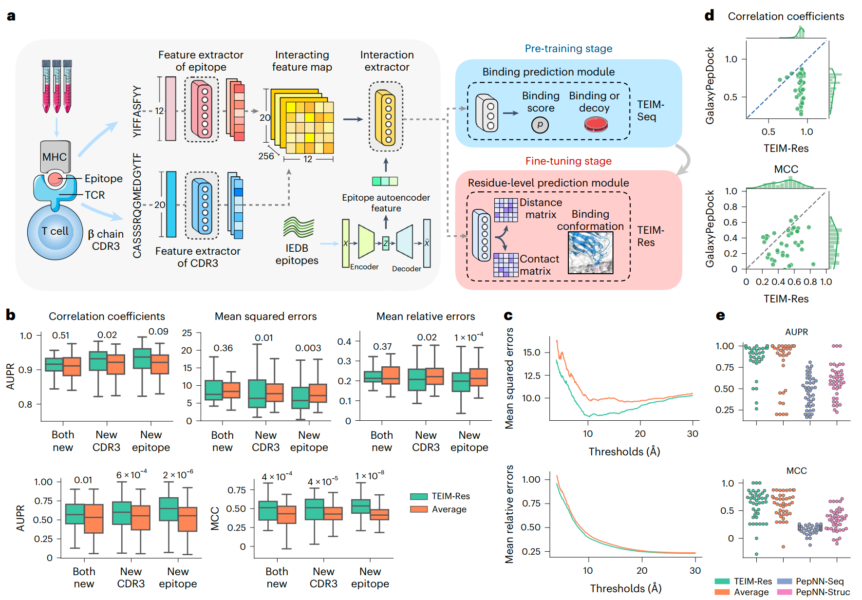 图1.TEIM模型结构和评估效果(a) TEIM-Seq和TEIM-Res的模型结构以及训练流程。除了最后一个模块外,TEIM-Seq和TEIM-Res模型共享相似的架构。它们都有特征提取器来分别学习CDR3和抗原表位的序列特征,然后将它们扩展到不同的维度以形成交互特征图。接下来,主要由二维卷积神经网络(2D CNN)组成的交互提取器用于提取成对残基交互信息。此外,由自动编码器生成的表位特征向量被馈送到交互提取器中以获取全局表位信息。最后,TEIM-Seq使用结合预测模块聚合所有成对交互来预测结合得分(即结合概率),而TEIM-Res使用由2D CNN层组成的残基级预测模块来预测距离矩阵和接触矩阵。训练流程包括两个阶段:首先在序列级结合数据上预训练TEIM-Seq,然后在残基粒度的结合数据上微调TEIM-Res。(b) TEIM-Res和其它基线方法相比,在三种不同数据划分设置下的性能表现。(c) TEIM-Res和平均基线的不同距离阈值内残基对的均方/相对误差。(d) GalaxyPepDock和TEIM-Res之间的性能比较。(e) TEIM-Res、平均基线和PepNN在预测结合矩阵任务上的性能比较