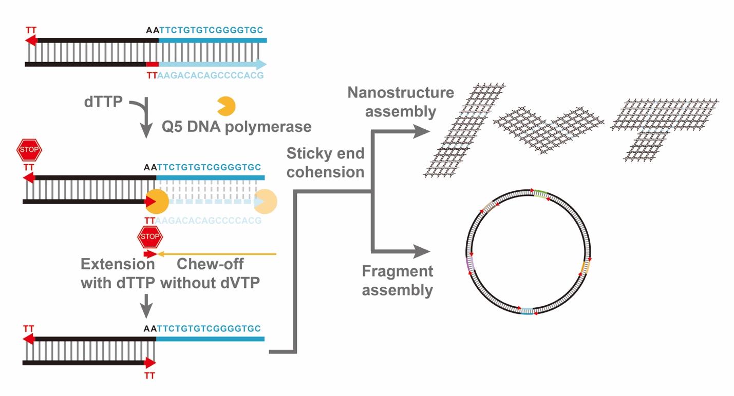 运用这种思路,研究团队报道了一种酶促组装具有重叠片段的DNA高级结构和双链片段的方法。研究的设计引入了一种具有3’至5’外切酶活性的DNA聚合酶(Q5 DNA聚合酶)来产生单链DNA粘末端,以实现特定的粘末端互补配对。通过精心的序列设计,Q5 DNA聚合酶的外切酶活性可以在只存在dTTP(不含有dATP、dCTP和dGTP)的情况下,消化预定序列3’末端只含有A,C和G核苷酸的部分。当酶作用到T核苷酸的位点时,由于体系中dTTP的存在,聚合酶活性会发挥作用,与外切酶活性进行一场“拔河”拉锯,从而使得消化作用被终止在特定位点。