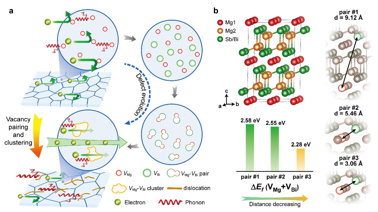 图1. 通过引入Bi空位诱导复杂缺陷演化机制的示意图及不同构型的缺陷对的形成能