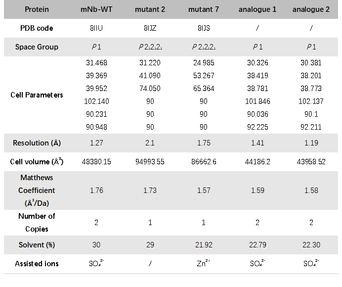 根据上述不同策略设计的突变体纳米抗体在与mNb-WT相同的结晶条件下,产生了性质完全不同的晶体类型。由于上文中验证不同纳米抗体之间在药学应用中彼此具有可替代性,因此,该研究中将mNb-WT及其突变体组成的不同类型晶体定义为伪多晶型晶体。晶体信息表明,mNb-WT的原始优势晶体为P1晶格,招募硫酸根离子辅助纳米抗体分子在晶格中排列,马修斯常数为1.76Å3/Da,对应的晶体溶剂含量约为30%。而对纳米抗体一级序列进行改造可成功诱导其晶体性质发生改变,改变纳米抗体在空间中的排列方式,逐步降低晶体溶剂含量至21.92%(表1)。