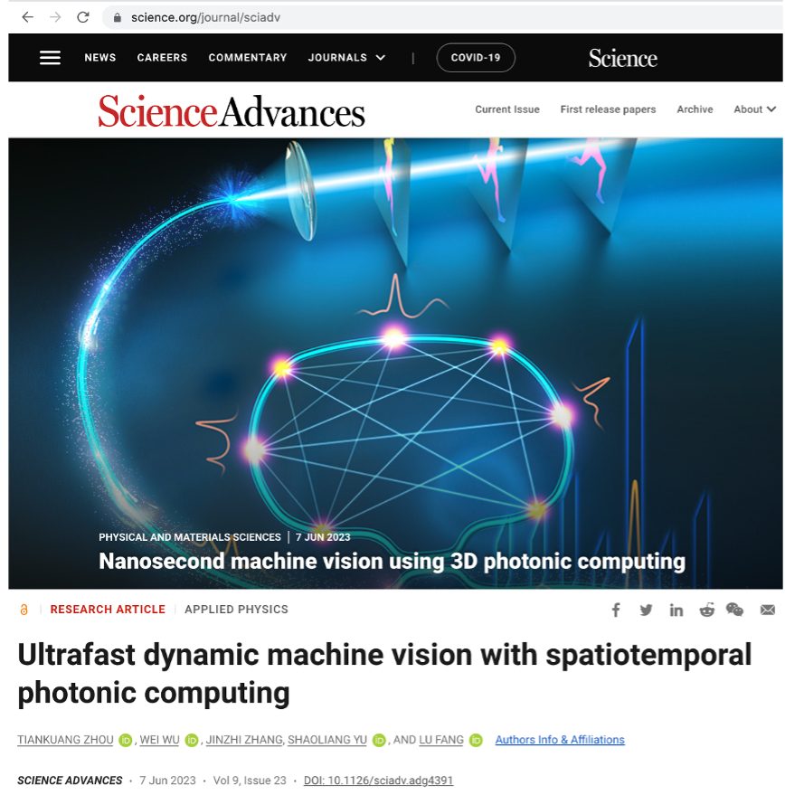 研究工作以“面向超快机器视觉的空时域光计算”(Ultrafast dynamic machine vision with spatiotemporal photonic computing)为题发表在国际期刊《科学·进展》(Science Advances)上,并入选期刊首页专题文章(feature article)。课题组博士生周天贶和吴蔚是本文共同第一作者,通讯作者为方璐副教授。