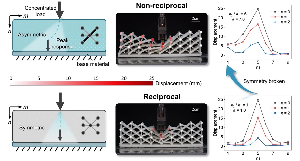 最近,乐动平台航天航空学院陈常青教授课题组利用力学超材料点阵结构,将低维非保守系统中的弹性波时域动力学演化行为,等效映射为空间尺度上高维点阵结构的静态变形模式,从而在一个静态的保守系统中实现了非厄米拓扑效应(图1)。相较于非厄米动力学系统,该静态系统中仅通过改变点阵的几何构型便能实现非厄米及等效非互易效应,而无需任何主动调控或能量注入,极大地降低了非厄米效应的触发条件(图2)。