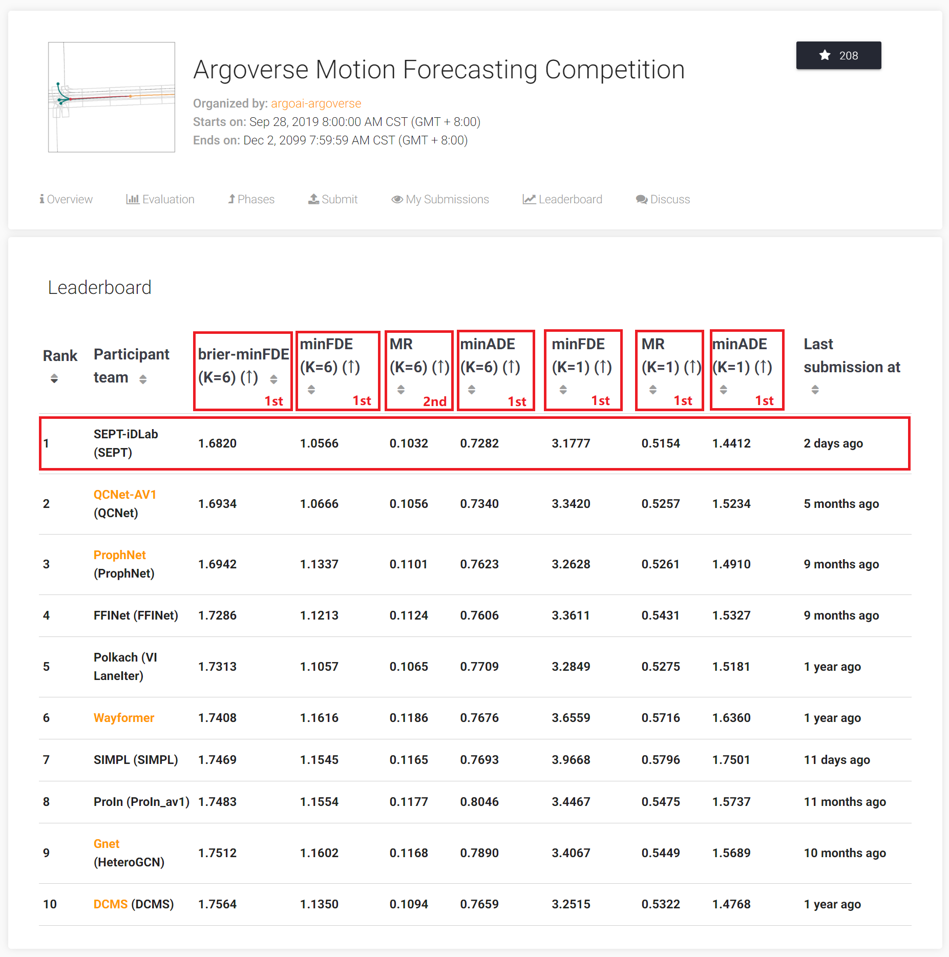 Argoverse竞赛榜单(网址:https://eval.ai/web/challenges/challenge-page/454/leaderboard/1279)